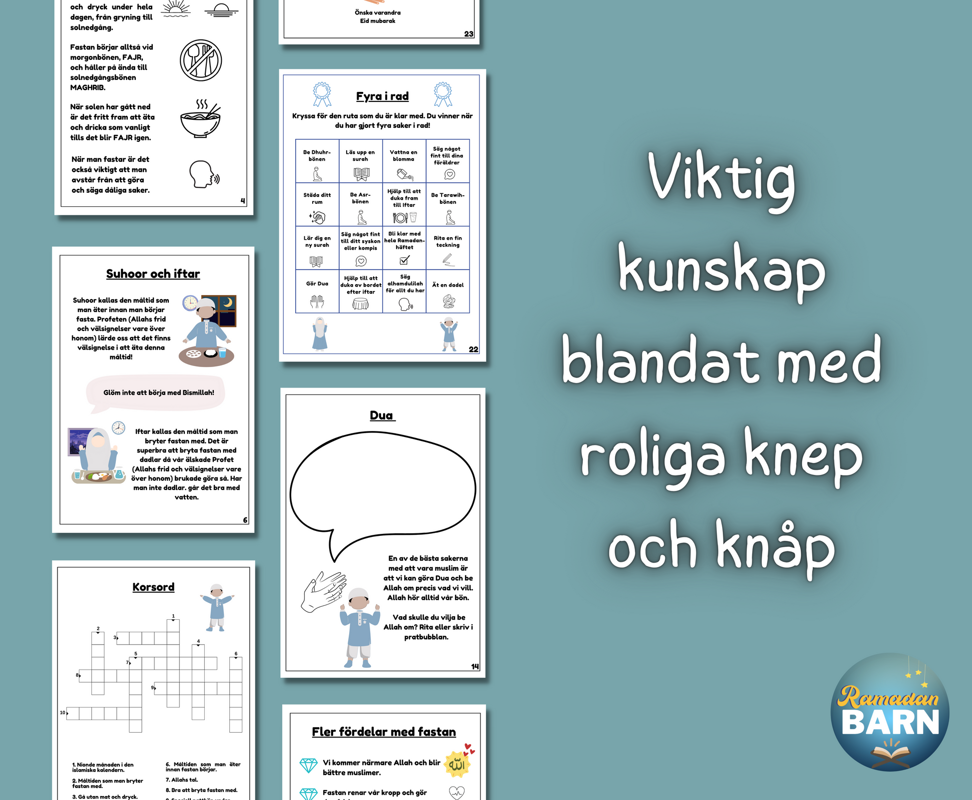 Det här aktivitetshäftet är tänkt att lära ditt barn, i åldern 7 år och äldre, grundläggande kunskap om Ramadan på ett underhållande sätt. Med våra egna barn i åtanke skapade vi detta häfte eftersom vi själva har saknat någonting liknande på svenska.